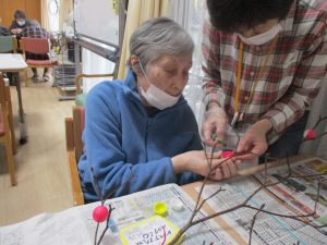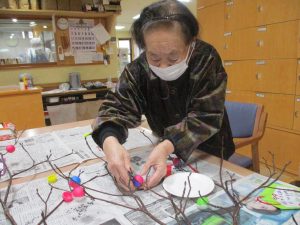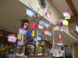 ミズキの木にだんごを刺し、船煎餅も飾りました。