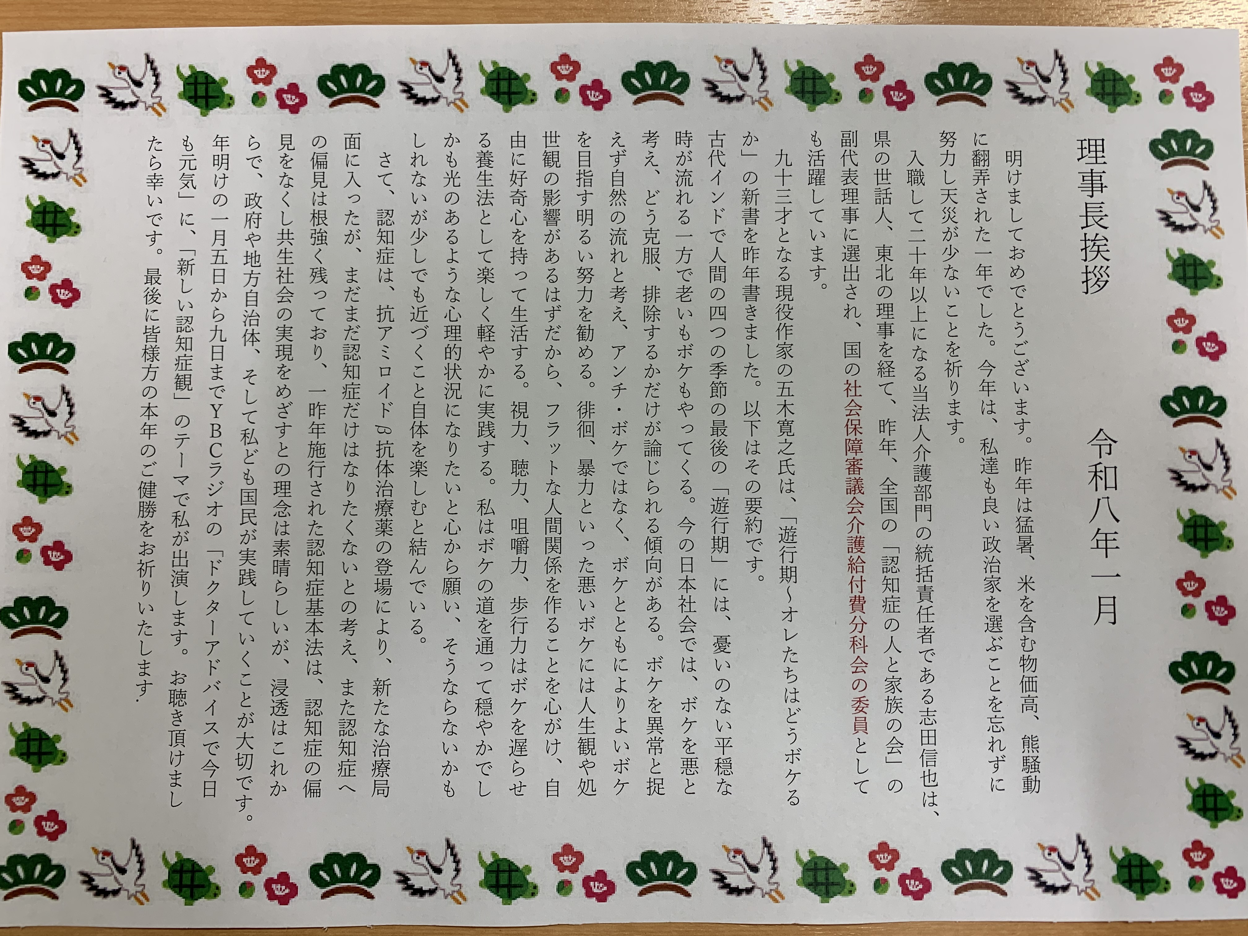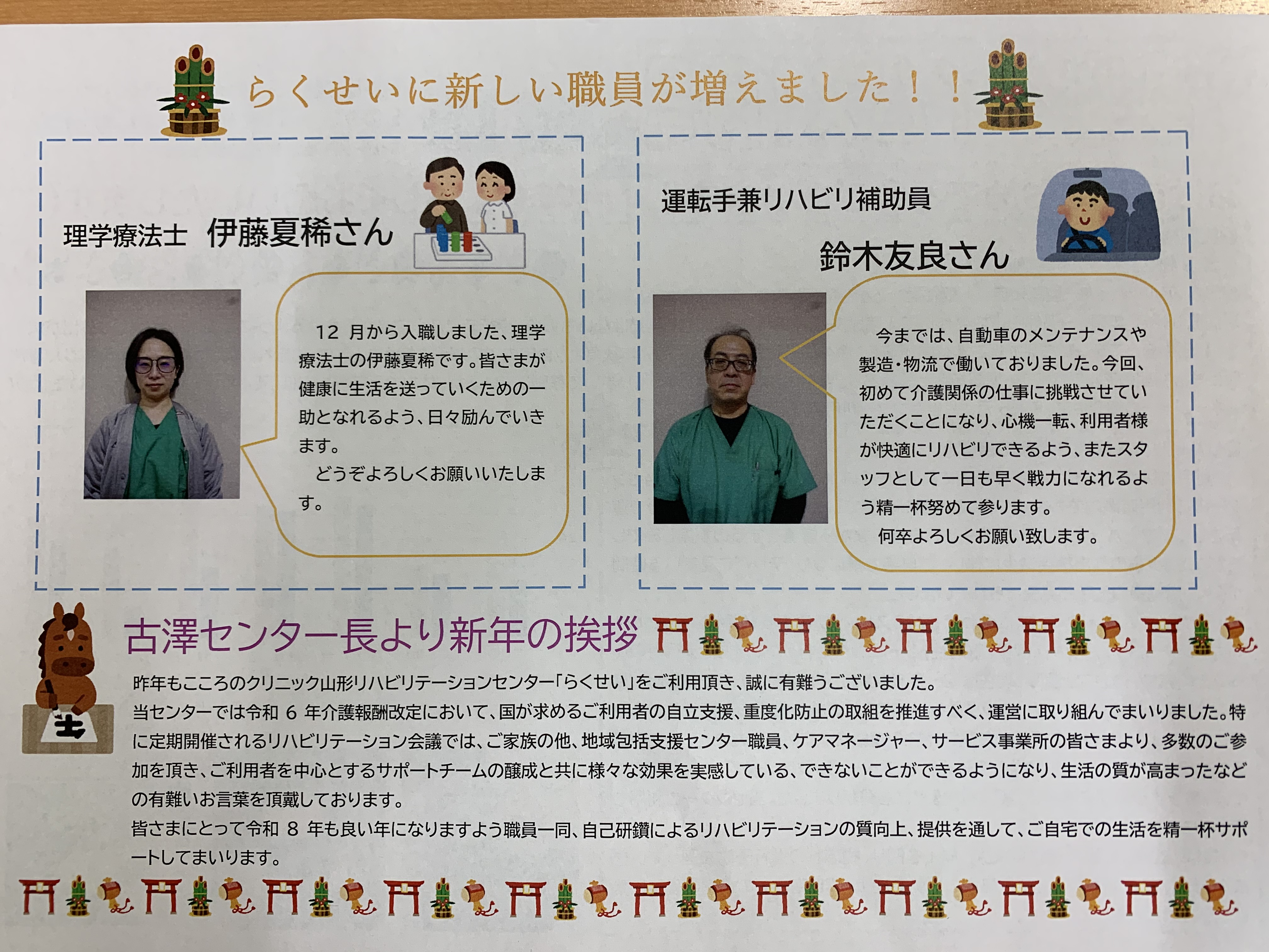 ホーム リハビリセンター「らくせい」 スタッフブログ 今年も宜しくお願いいたします(^^) スタッフブログ 今年も宜しくお願いいたします(^^) あけましておめでとうございます(^^) 今年も宜しくお願いします!! 理事長挨拶と広報誌を利用者様、事業所様に配布させていただいています。 是非読んでいただければと思います。 今年1年皆様の健康とご多幸をお祈りしています☆ 「スタッフブログ リハビリセンター「らくせい」 活動報告」2026.01.10.(土) コンテンツメニュー イベント・お知らせ スタッフブログ リハビリセンター「らくせい」 活動報告 最近の記事 今年も宜しくお願いいたします(^^) 良いお年を~ 12月の広報誌 感染症対策! 今にも飛んでいきそうなちょうちょが描けました! スペシャルコンテンツ お知らせ