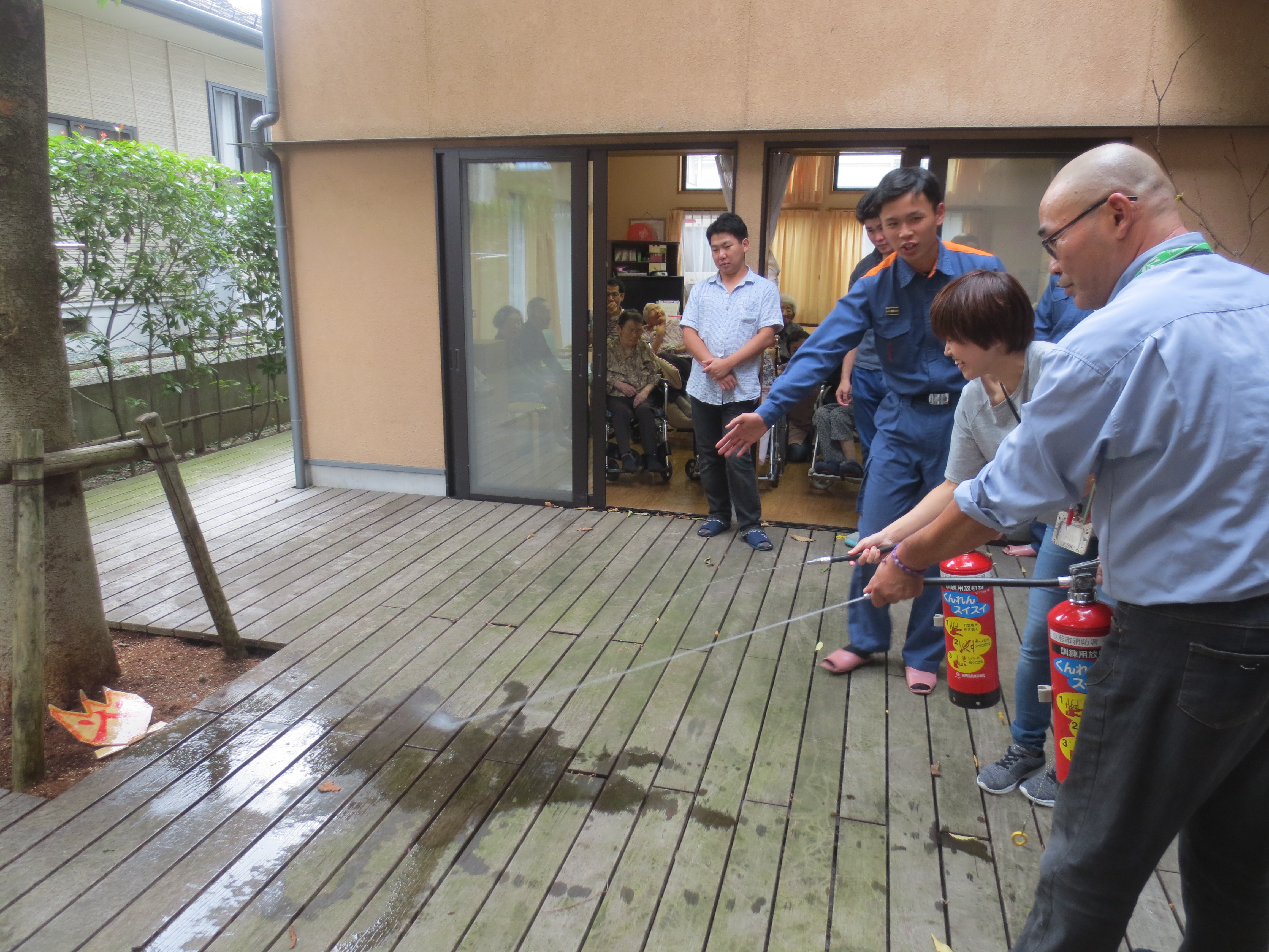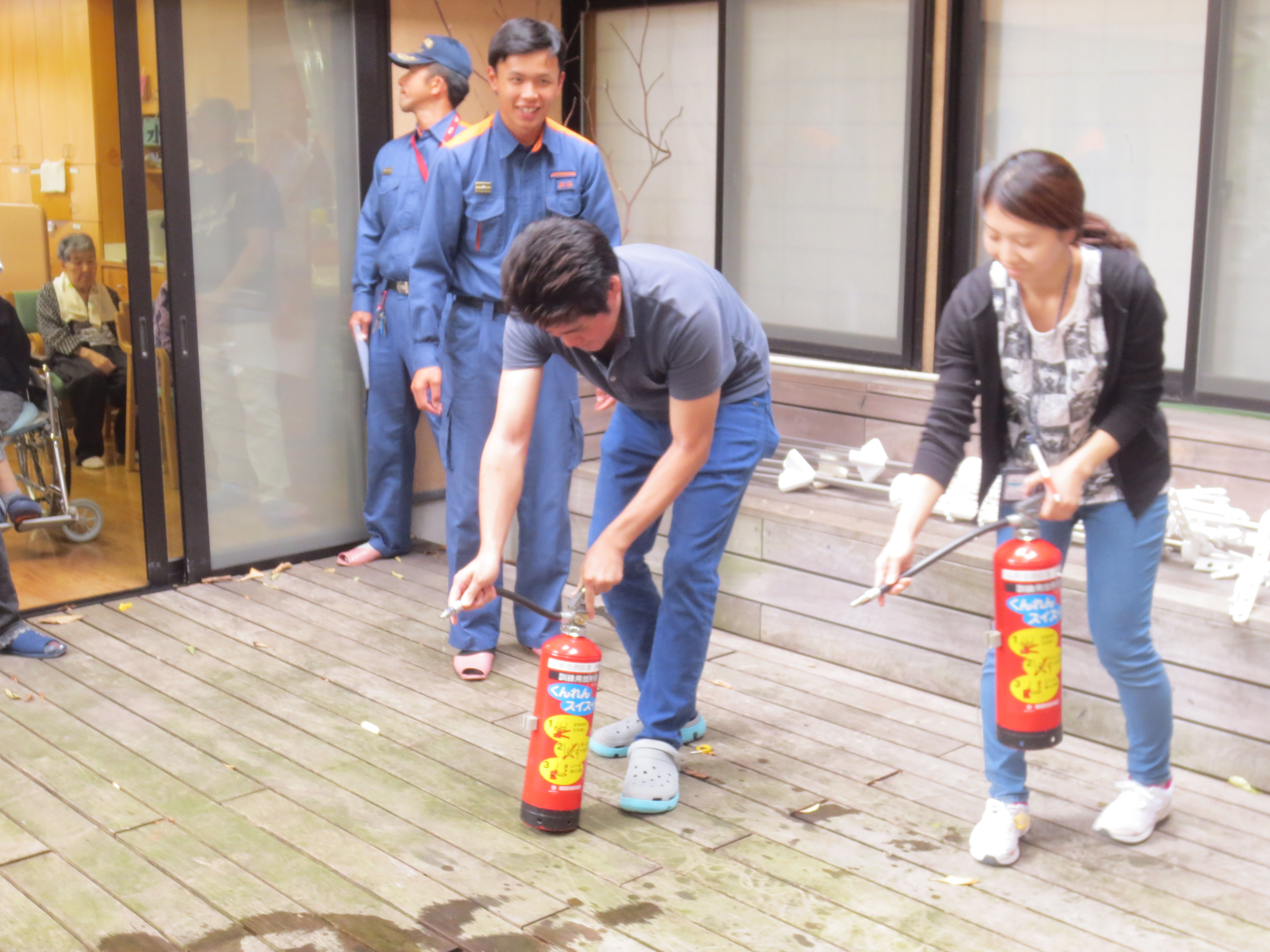 総合訓練とは初期消火訓練、通報訓練、避難誘導訓練のことを指し、今回は初期消火訓練のご様子を紹介します。