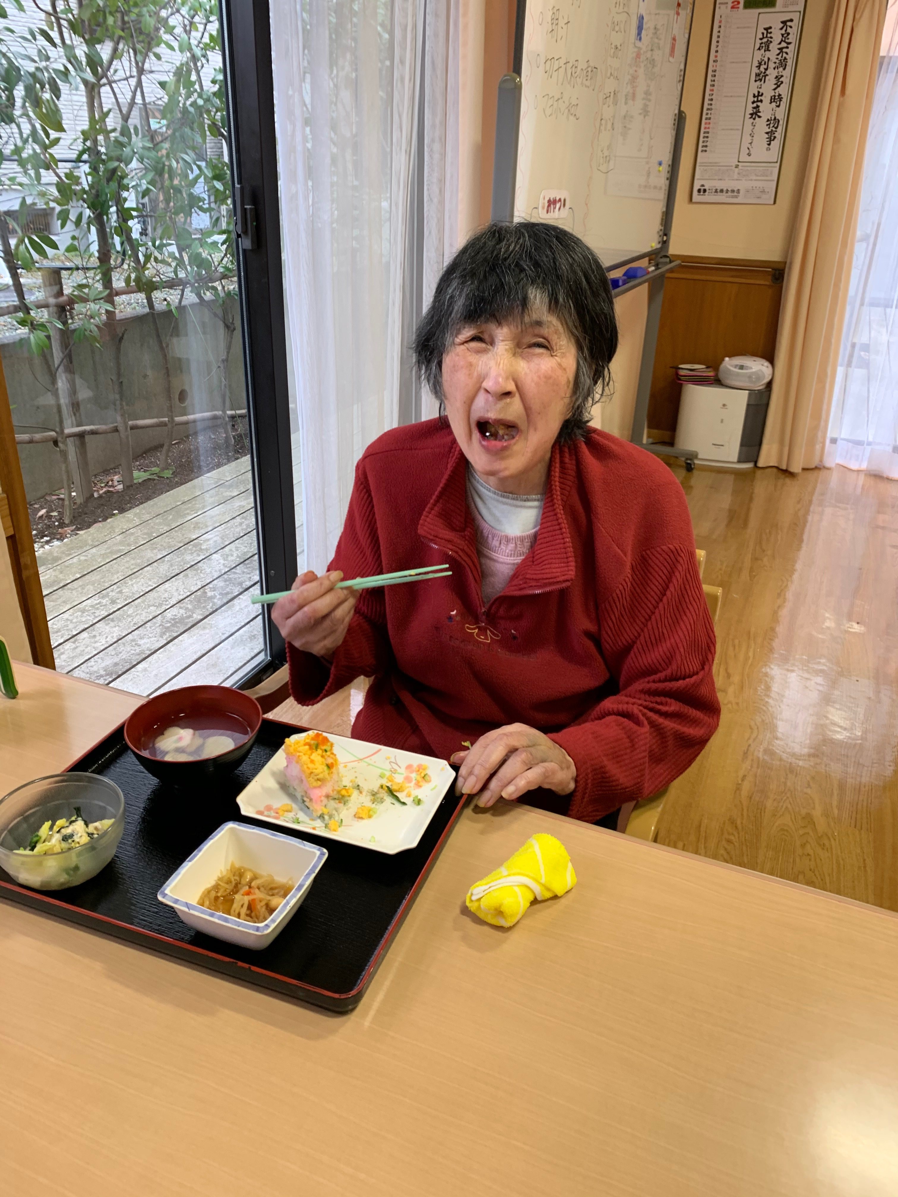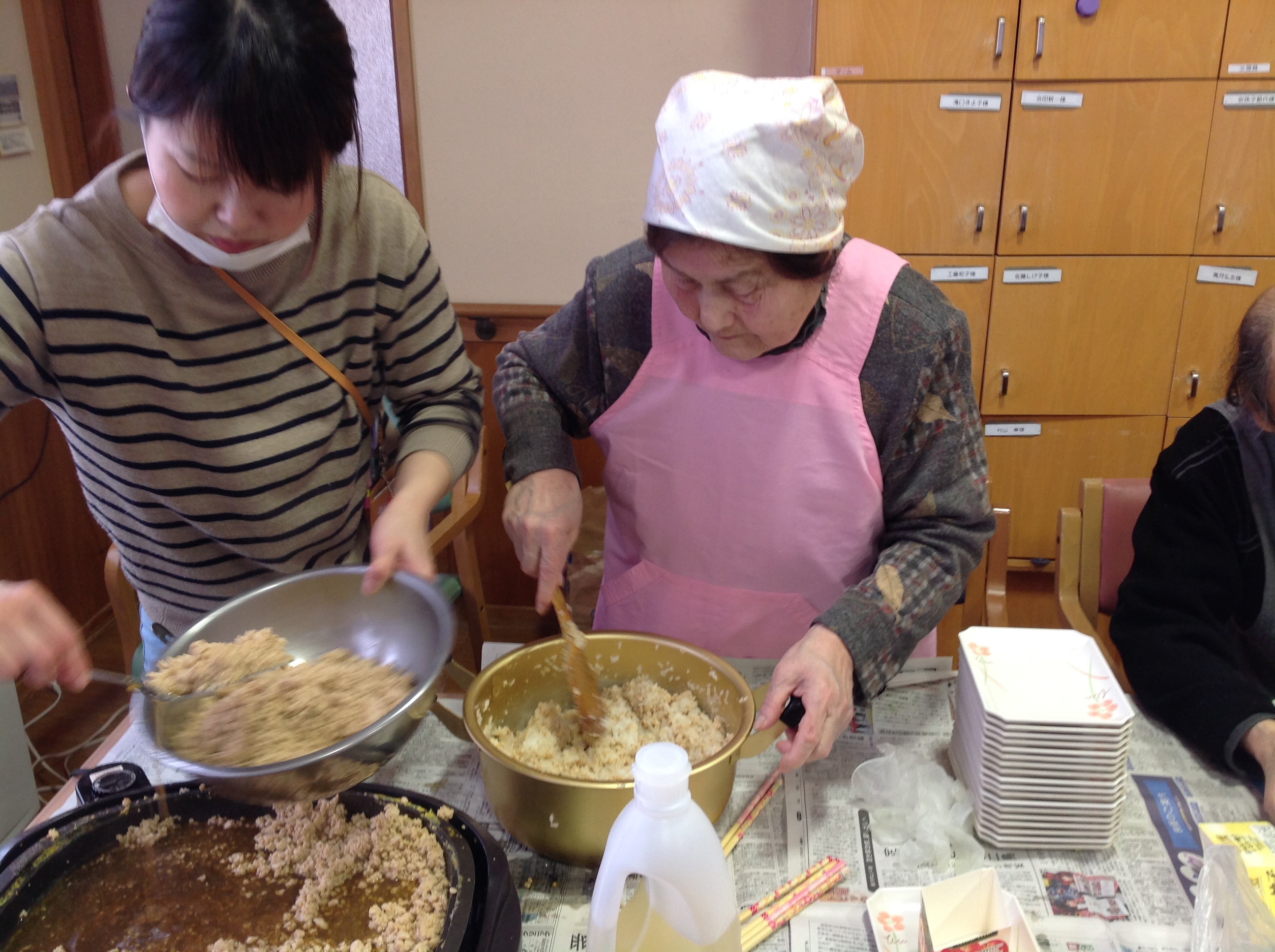 ひし餅に見立てたちらし寿司を、皆さんで協力して作りました‼