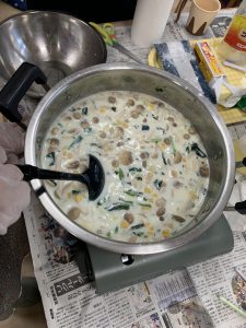 鶏肉、きのこ、玉ねぎ、ほうれん草、コーンと具沢山のクリームスープで美味しそうな香りがしてきました。