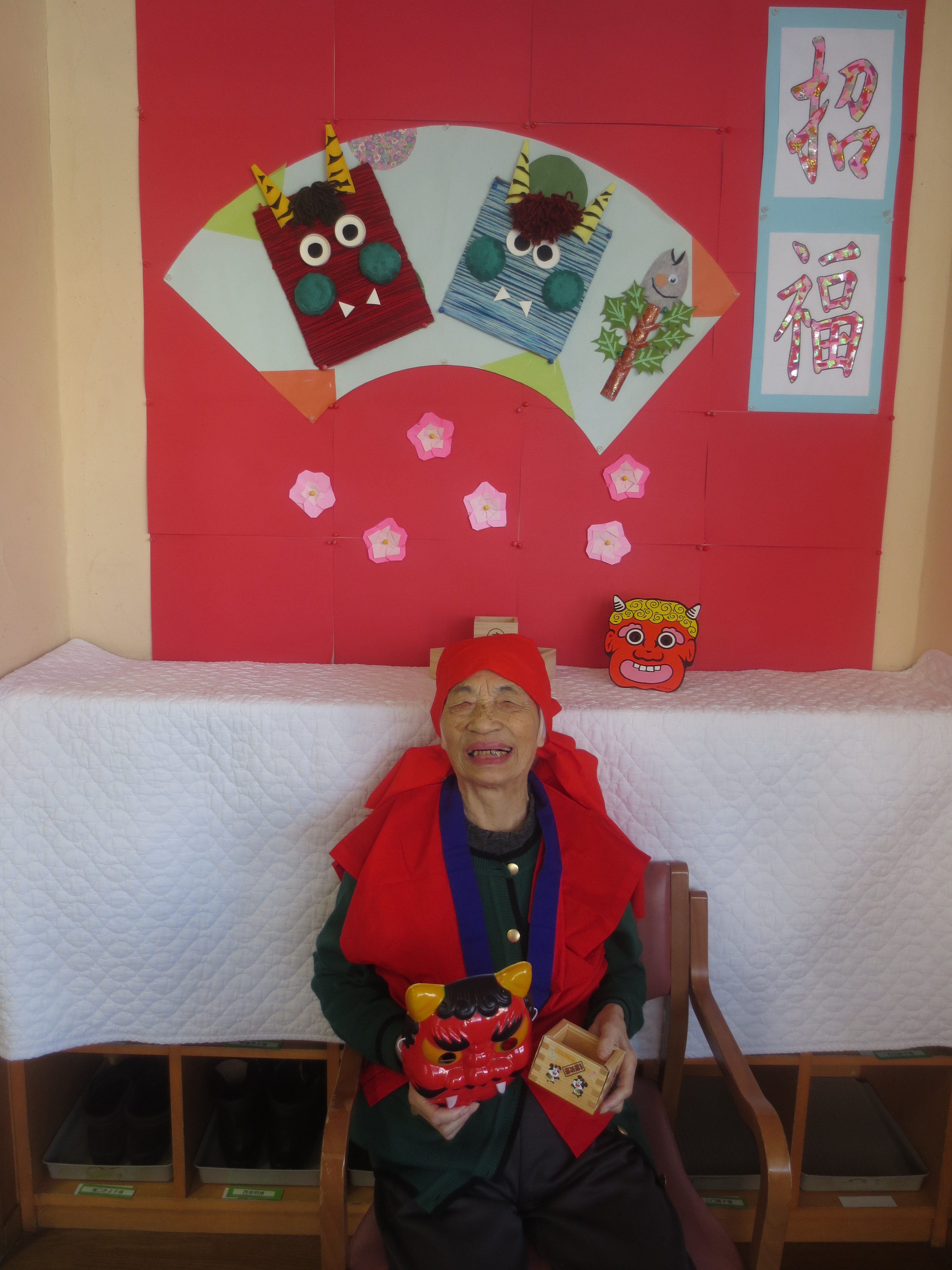 等身大の鬼の口に、豆(お手玉)を入れ、手先の機能訓練を兼ねたレクレーションを楽しく行っています。