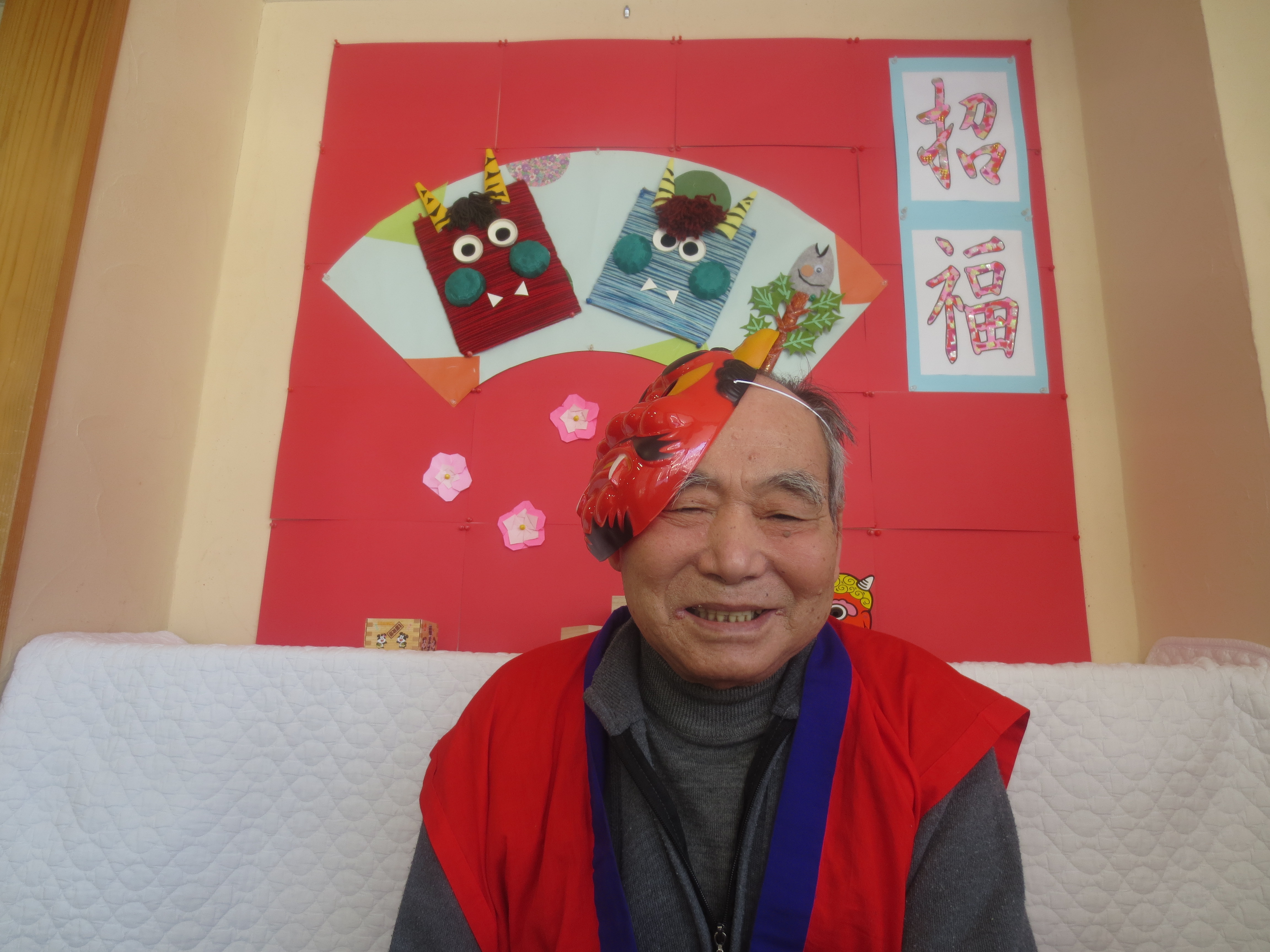 節分祭が行なわれました。赤鬼!!青鬼!!に新聞紙を丸めて作った、手作りの豆を当てます。大勢で行う事で、普段より楽しく体を動かしていらっしゃいます。