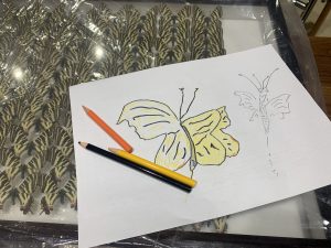 今日はちょうちょ採集が趣味の利用者様がちょうちょの絵を描いてくださいました。触角がポイントだとお話されていました。職員と利用者様で一緒に、色塗りを行い完成です!
